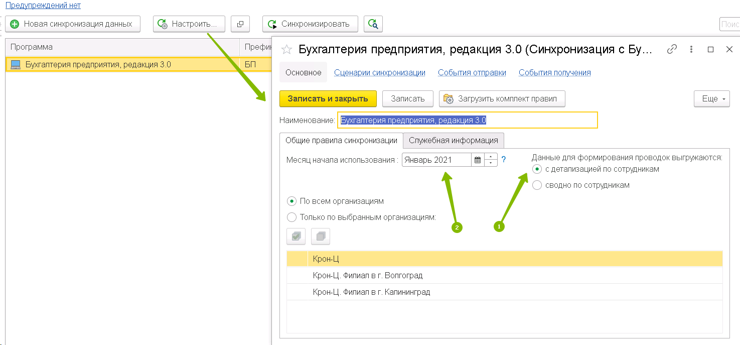 1. В ЗУП – Администрирование – Синхронизация данных — Настройки синхронизации — Настроить указано, что выгрузка производится сводно, а не с детализацией по сотрудникам.