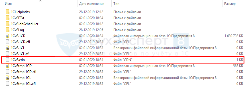 Остальные файлы — это временные файлы и файлы блокировок, которые формируются при запуске программы и при ее закрытии автоматически исчезают. Файл 1Cv8.cdn отвечает за блокировку ИБ. Удалив его, блокировка будет снята, и наша база вновь запустится.