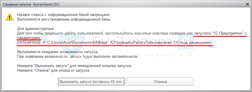 Посмотрите еще раз внимательно на сообщение, в котором прописана подсказка Запустите «1С: Предприятие» с параметрами, и указаны параметры запуска для вашей базы с указанием пути к ней – ENTERPRISE /F»C:\Users\Acer\Documents\InfoBase» /CРазрешитьРаботуПользователей /UC<код разрешения>.