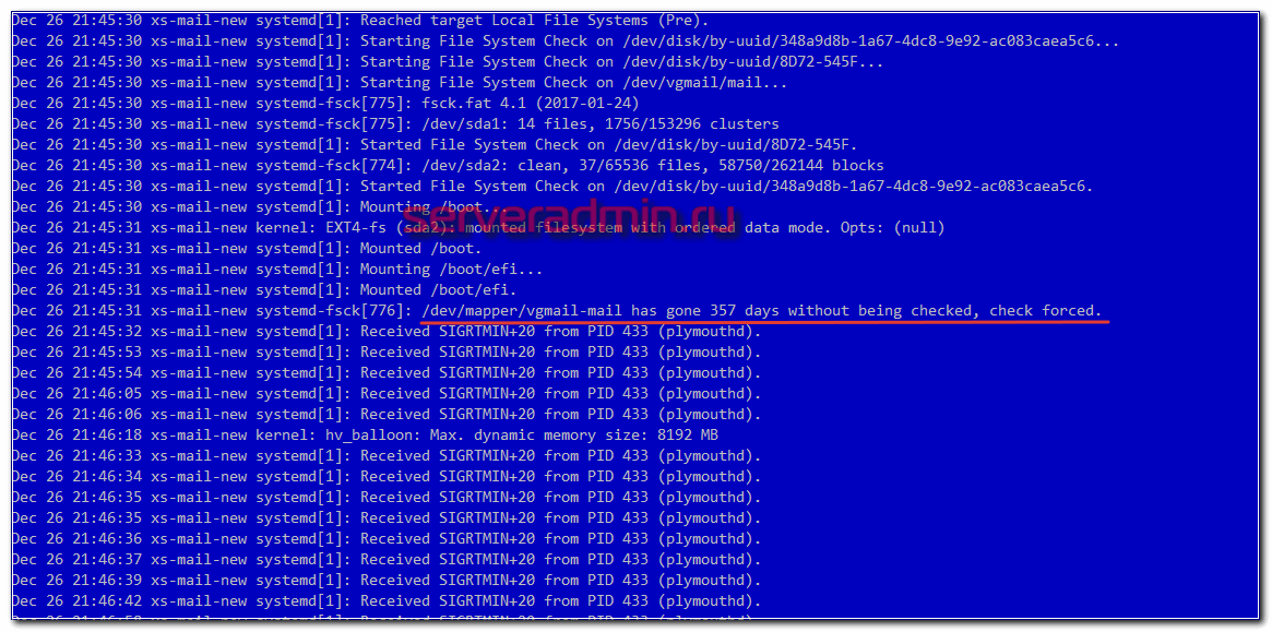 systemd-fsck: /dev/mapper/vgmail-mail has gone 357 days without beign checked, check forced.