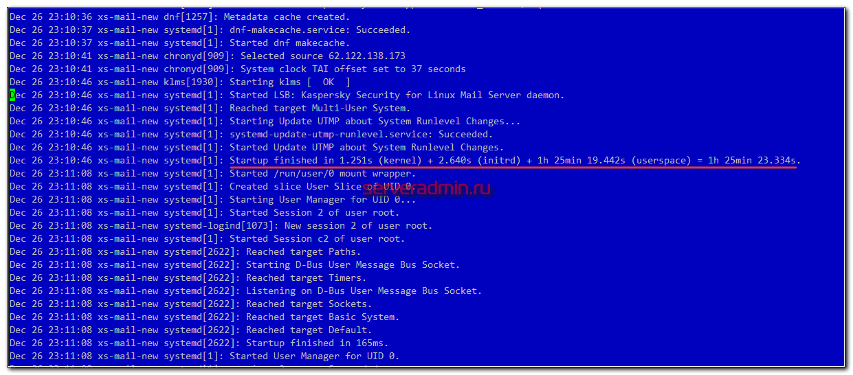 В итоге, все завершилось и операционная система штатно загрузилась. В логах увидел подробности:
