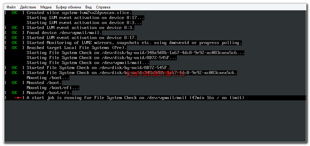 The section is being checked for errors. Moreover, this lvm section is 3Tb in size, it stores a mail archive. There is no indication and it is not clear what all this is connected with and how long it will last. The server is in operation, a bunch of people are connecting. I see that the operation seems to be planned, since there are no errors. But the fact that the server is down is already a mistake. Most importantly, it is not clear how long this check might take. And there is always a chance that this is an abnormal situation and there are some problems with the section. This is the worst deal.
