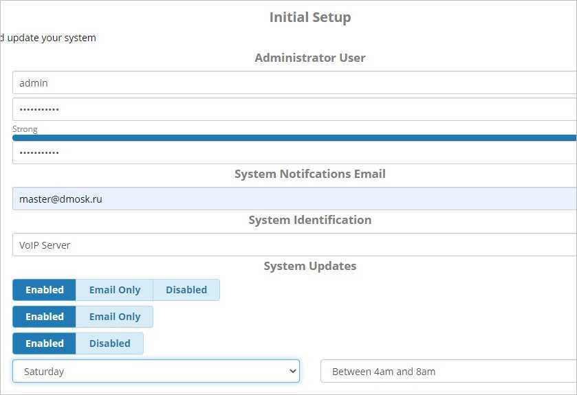 Открываем браузер и заходим по адресу http:<IP-адрес сервера> — должна открываться страница конфигурирования FreePBX. Задаем настройки: