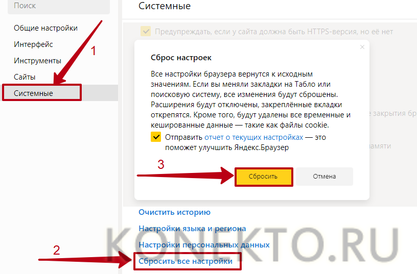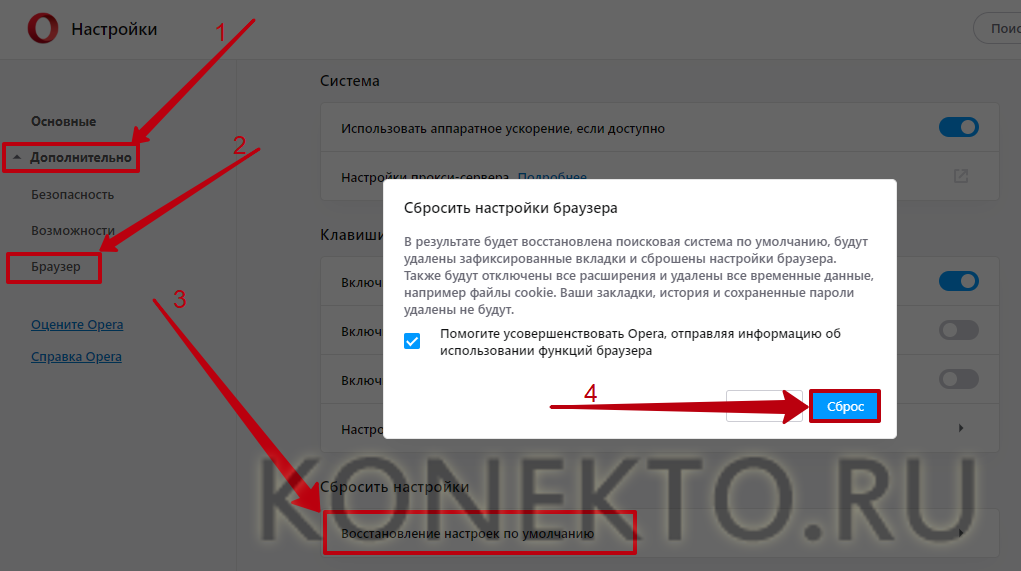 Если браузер постоянно запускается сам по себе, решить проблему можно при помощи сброса настроек. Эта операция приведет к удалению временных данных, отключению расширений, откреплению вкладок, смене стартовой страницы и поисковой системы. При этом будут сохранены пользовательские пароли, закладки и история просмотров.