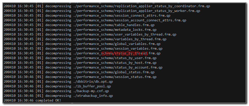 # systemctl stop mysqld && rm -rf /var/lib/mysql/* # xtrabackup --copy-back --target-dir=/root/backupdb/full # chown -R mysql:mysql /var/lib/mysql # systemctl start mysqld