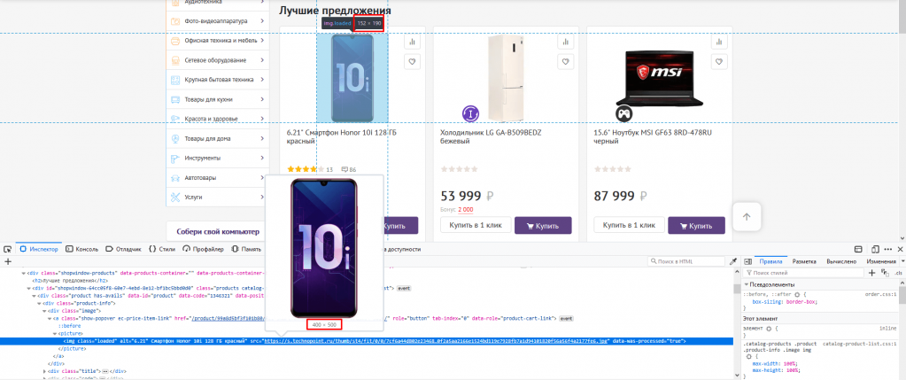Наиболее частый сценарий – это использование размеров изображений, которые не соответствуют отображению в браузере. Например, у нас на странице выводится список товаров с картинками. Сам контейнер в браузере имеет размер 152 * 190 пикселей, а вот картинка при этом используется 400 * 500 пикселей.