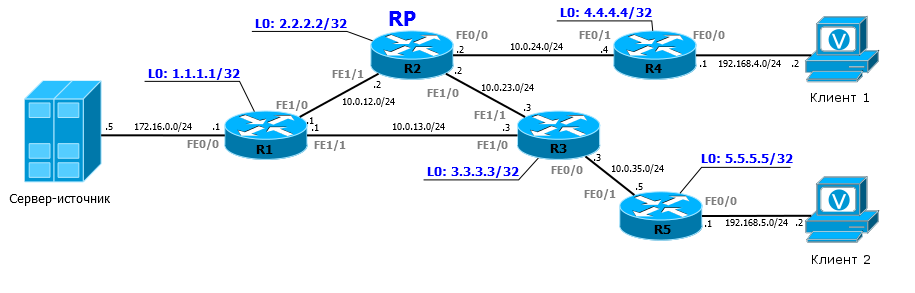 Рис. 1. Настройка сети с многоадресным источником и получателями