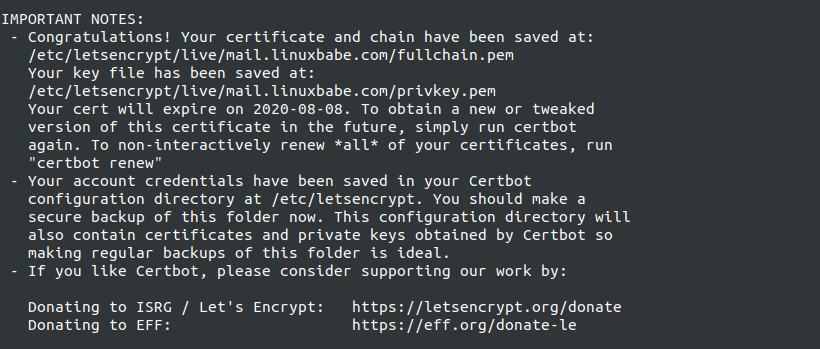 If everything went well, you will see the following text indicating that you have successfully obtained a TLS certificate. Your certificate and chain have been saved at directory.