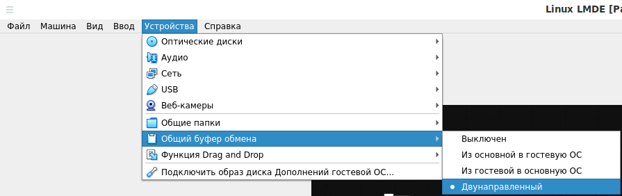 Например «Общий буфер обмена» → «Двунаправленный» позволяет копировать и вставлять текст между хост-системой и гостевой системой.