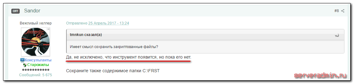 Если вам необходимо любой ценой восстановить зашифрованные файлы, а самостоятельно вы это сделать не можете, рекомендую сразу обращаться к профессионалам. Неправильные ваши действия могут привести к тому, что файлы вы вообще не сможете получить назад. Как минимум, вам нужно снять посекторный образ системы и сохранить его, прежде чем вы сами начнете что-то делать. Как сделать образ системы рассказывать не буду, это выходит за рамки данной статьи.