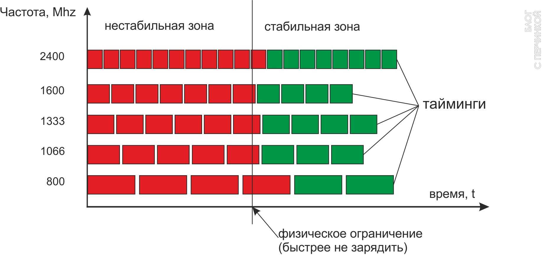 График таймингов, в зависимости от частоты. Красным обозначено минимальное количество таймингов до преодоления физического ограничения.