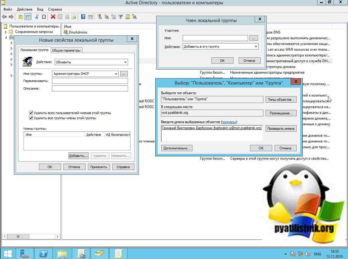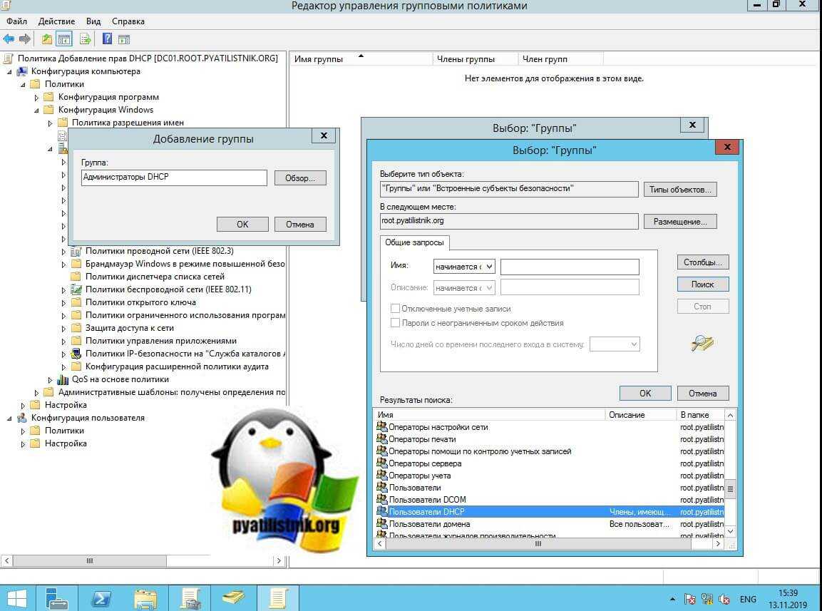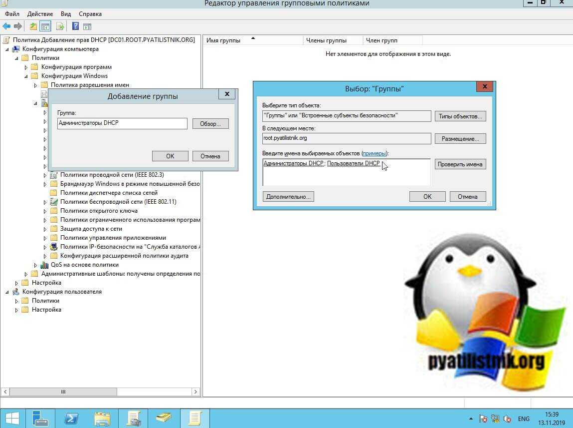 Добавляем ваши группы «Пользователи DHCP» и «Администраторы DHCP». Тут мы добавим доменные группы, или так же просто добавим локальные без префикса домена.