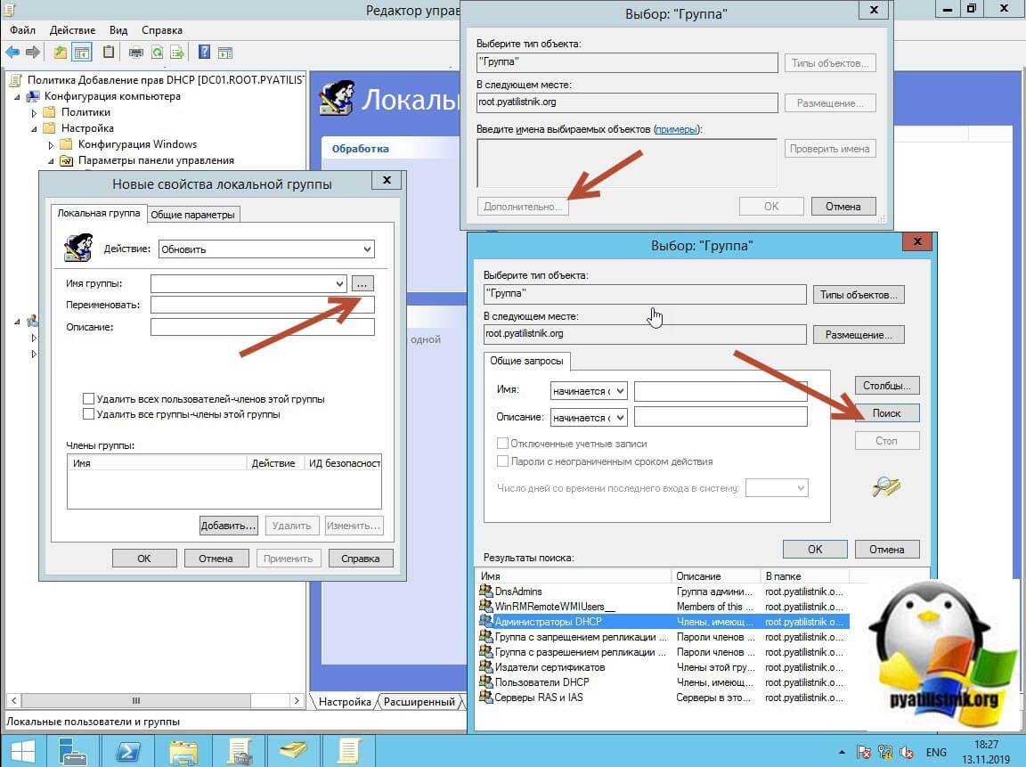 В имени группы нажмите кнопку поиска, далее нажимаем «Дополнительно». Находим группу «Администраторы DHCP».