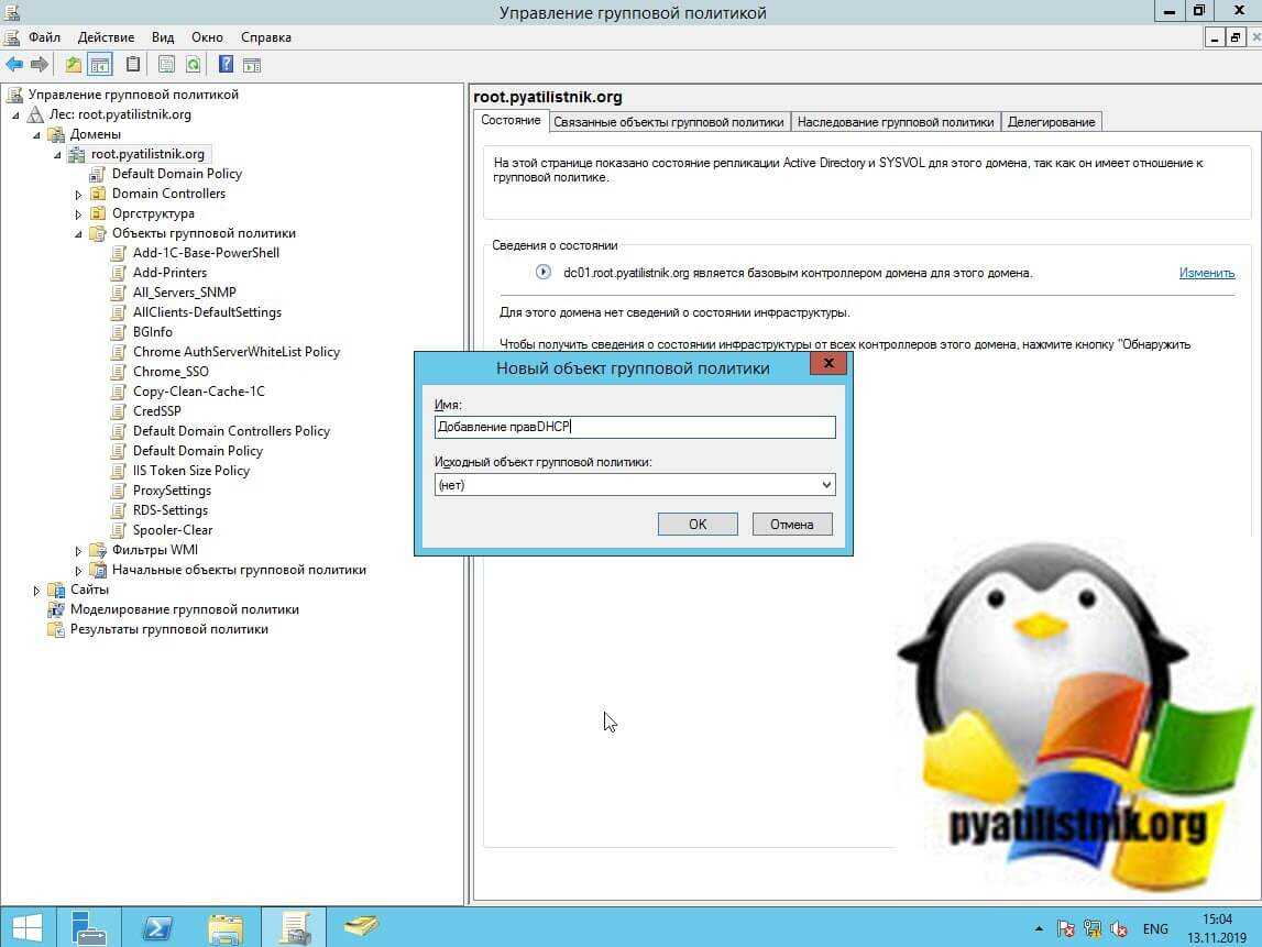 с моей стороны нужно стараться все централизовывать, и назначение прав на серверах не исключение. Групповая политика в этом поможет, и ее большой плюс от ручной настройки, что в случае изменения на локальном сервере, она все вернет как было в течении 120 минут. Открываем оснастку «Управление групповой политикой», создаем новую или редактируем существующую политику. Я создам новую, назову ее «Добавление прав на DHCP» и применю ее к нужному организационному подразделению.