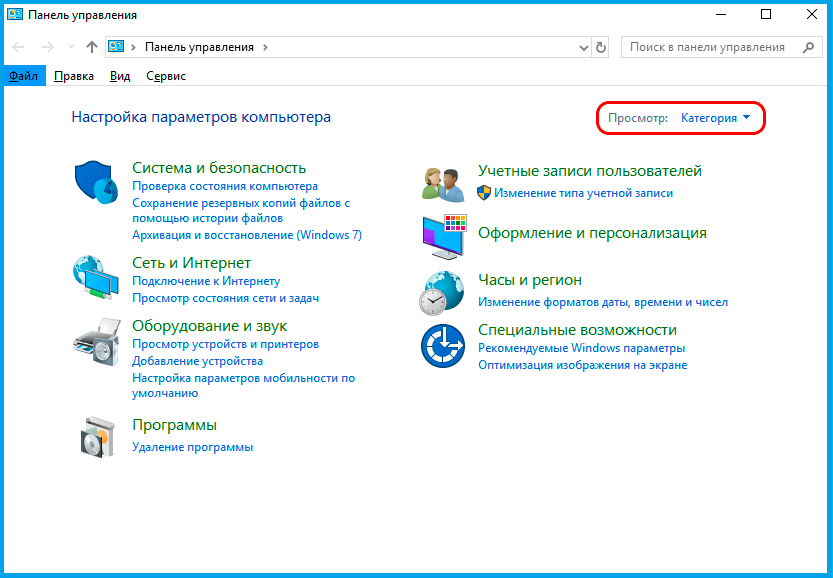 2. Установите параметр “Просмотр:” (находится в правом верхнем углу) в состояние “Категория”.