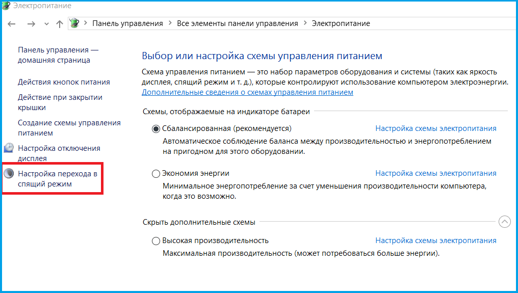 4. В левой части монитора расположено меню из различных параметров. Если вы не нашли то, что хотите настроить, то кликните по пункту “Настройка перехода в спящий режим”.