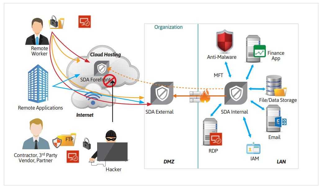Подход от компании Safe-T — технология Reverse Access — сделает DMZ еще более безопасной. Эта технология, основанная на использовании двух серверов, устраняет необходимость открытия любых портов в межсетевом экране, в то же самое время обеспечивая безопасный доступ к приложениям между сетями (через файрвол). Решение включает в себя: