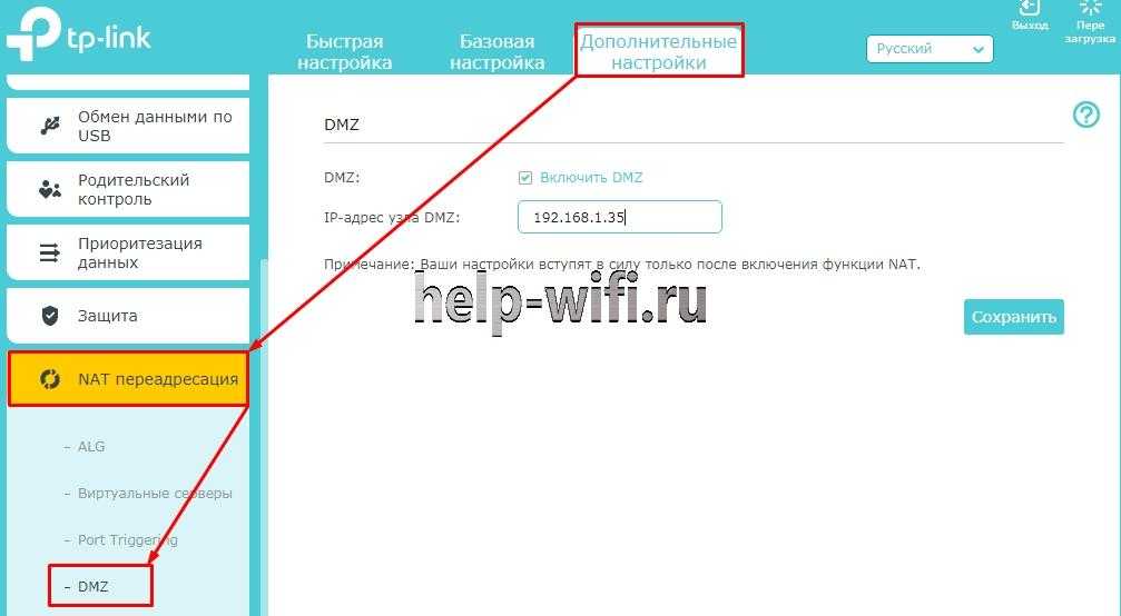 - На роутерах TP-Link откройте пункт «Переадресация», а в нём будет подпункт DMZ.