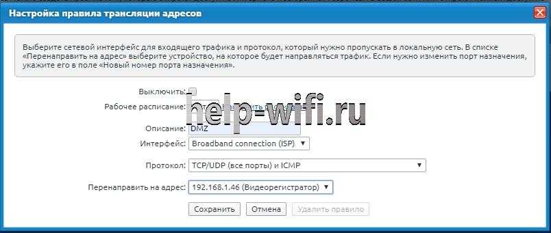Видите как просто. В этом и есть удобство DMZ. Ещё одним плюсом является, возможность настройки маршрутизатора (роутера) не зная какой порт будет выбран для допустим видеорегистратора. И как следствие дальнейшая смена порта доступа, независимо от настроек маршрутизатора.