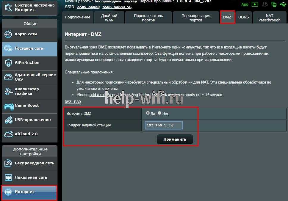В левой части окна, в меню найдите вкладку «Интернет» и нажмите на неё. Теперь кликните по разделу DMZ. Активируйте функцию и вбейте адрес устройства. В конце не забудьте нажать «Применить».