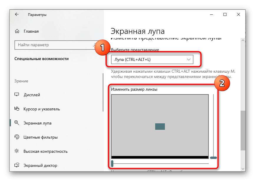 Отдельная настройка доступна для режима «Лупа», о котором мы поговорим в следующем шаге. Пользователю предлагается выбрать размер, передвигая ползунок по высоте и ширине.