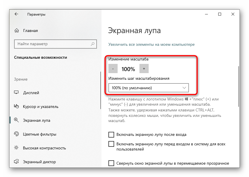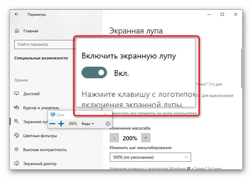 По умолчанию экранная лупа запускается с масштабом увеличения 200%. Шаг изменений составляет 100%.