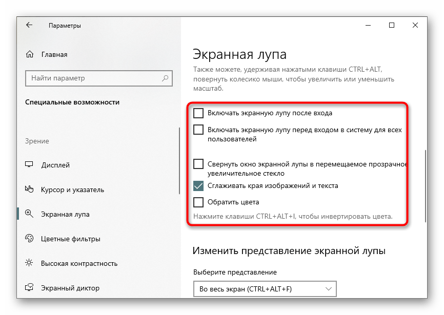 Далее идут дополнительные параметры. Экранную лупу можно включить автоматически сразу же после входа в операционную систему или еще на этапе выбора пользователей. Доступно сворачивание окна в перемещаемое увеличительное стекло для удобства навигации по рабочему столу. По умолчанию активирована опция сглаживания краев, а также можно задать инверсию цветов.