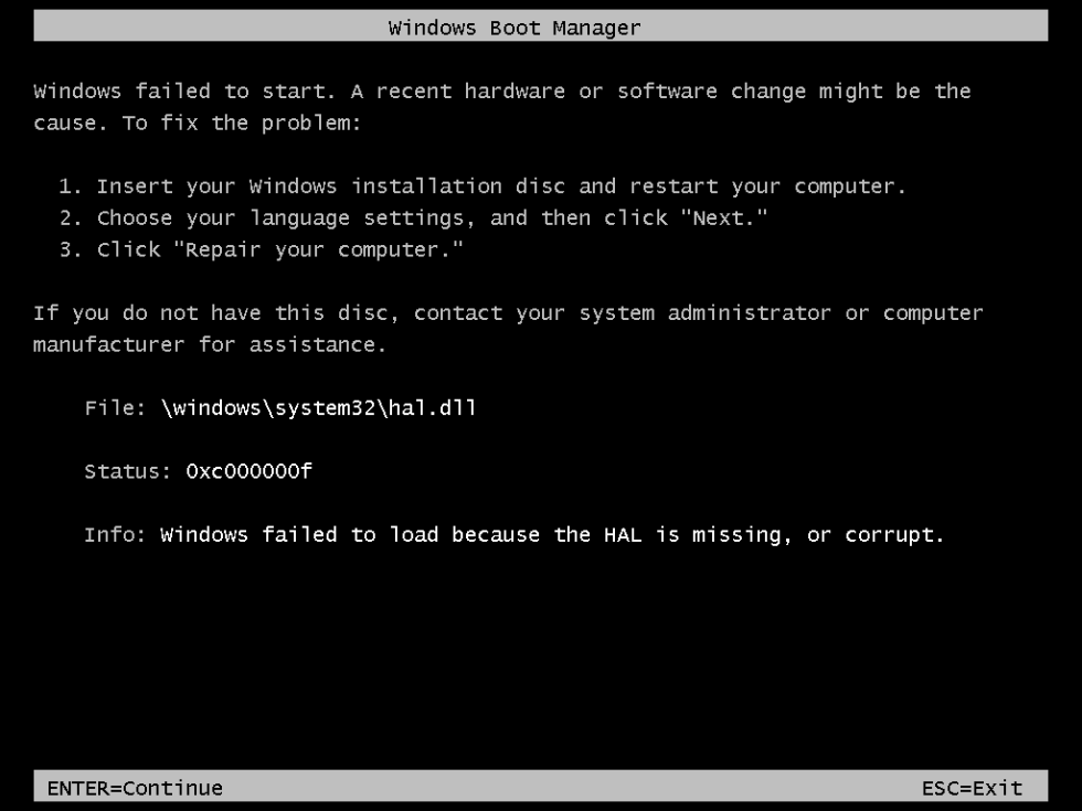 Info: Windows failed to load because the HAL is missing, or corrupt.