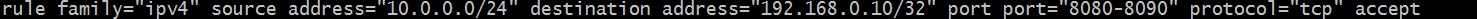 $ firewall-cmd --permanent --zone=testing --add-rich-rule='rule family=ipv4 source address=10.0.0.0/24 destination address=192.168.0.10/32 port port=8080-8090 protocol=tcp accept' success