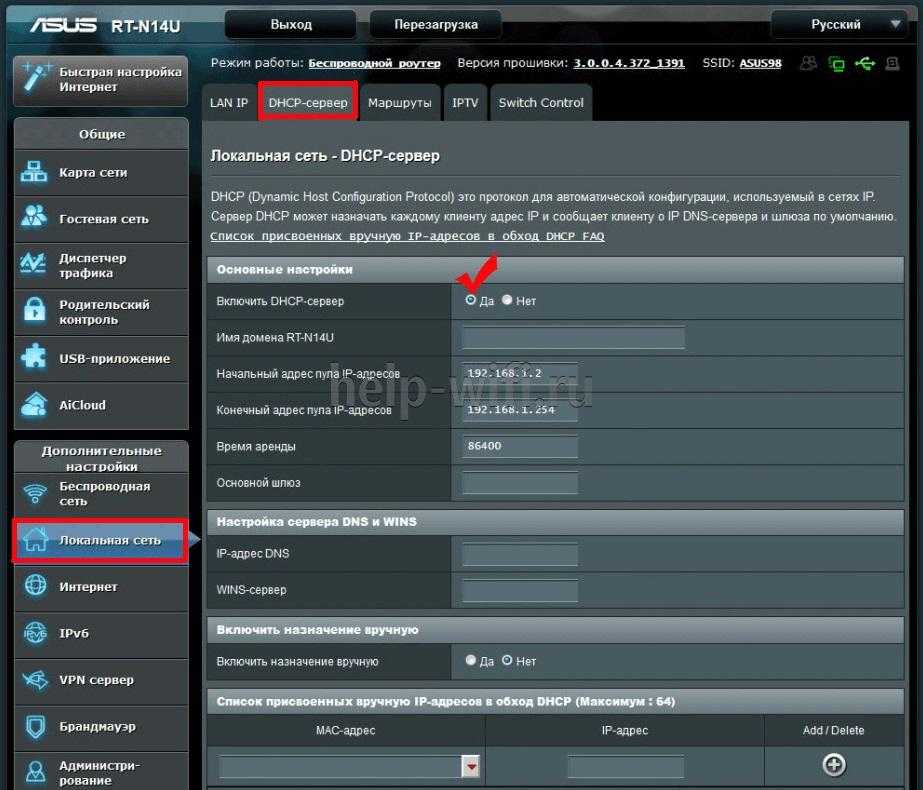 Настройка роутера этой фирмы происходит следующим образом. В левом краю web-панели есть пункт “Локальная сеть”, нажав на него, нужно выбрать вкладку DHCP-сервер. На открывшейся странице нужно отметить пункт “Да” в графе “Включить DHCP-сервер”.