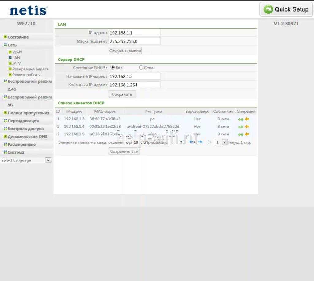 Настройки роутеров Netis несколько более скудные, здесь можно включить и отключить DHCP на маршрутизаторе и задать диапазон выдаваемых IP.