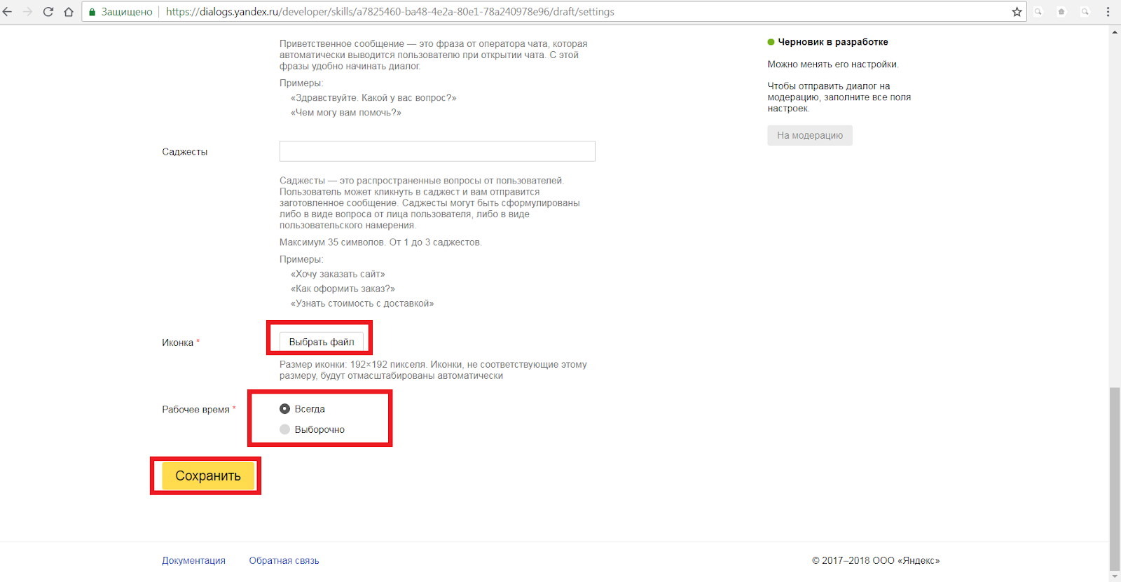 - сведения для публикации в каталоге (название, категория, начальная фраза, с которой начинается диалог, рабочее время, иконка);
