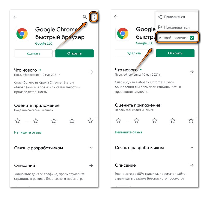 Рекомендуется включить автообновление для Гугл Хром, поскольку разработчики регулярно выпускают апдейты, улучшающие работу оборевателя. Для этого перейдите на страницу браузера в Play Market, затем тапните по троеточию вверху. В появившемся меню поставьте отметку напротив опции «Автообновление».