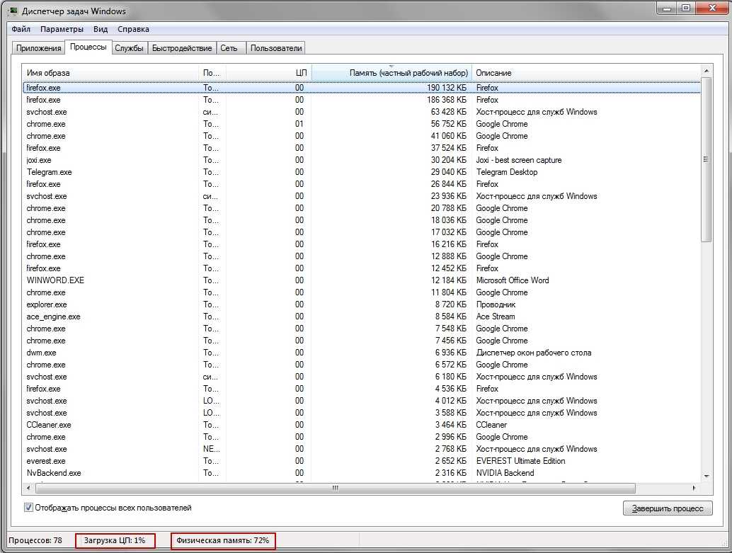 обратить внимание на информацию в нижней панели по загрузке ЦП и физической памяти.