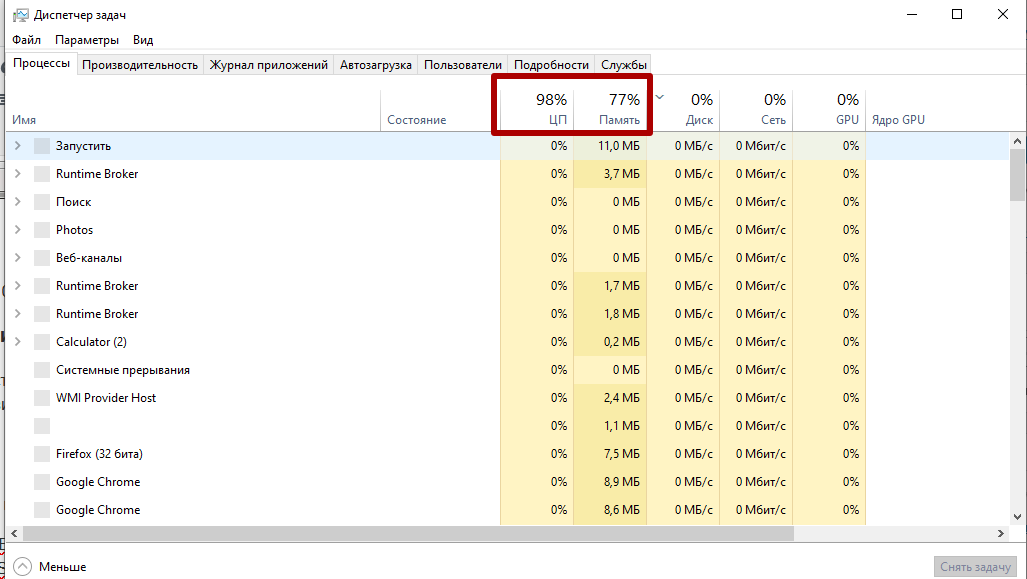В нижней строке окошка вы можете посмотреть, насколько загружены центральный процессор и физическая память в настоящий момент. Если какое-то из значений превышает 85-90% — рекомендуется позакрывать ненужные в данный момент приложения и неиспользуемые вкладки в Гугл Хром.