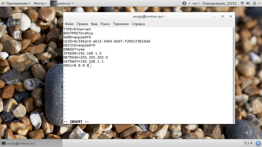 Для установки статического IP адреса нужно задать значение BOOTPROTO — static, а также указать IP адрес, шлюз, маску сети и DNS. Вот пример конфигурации сети CentOS для нашего интерфейса:
