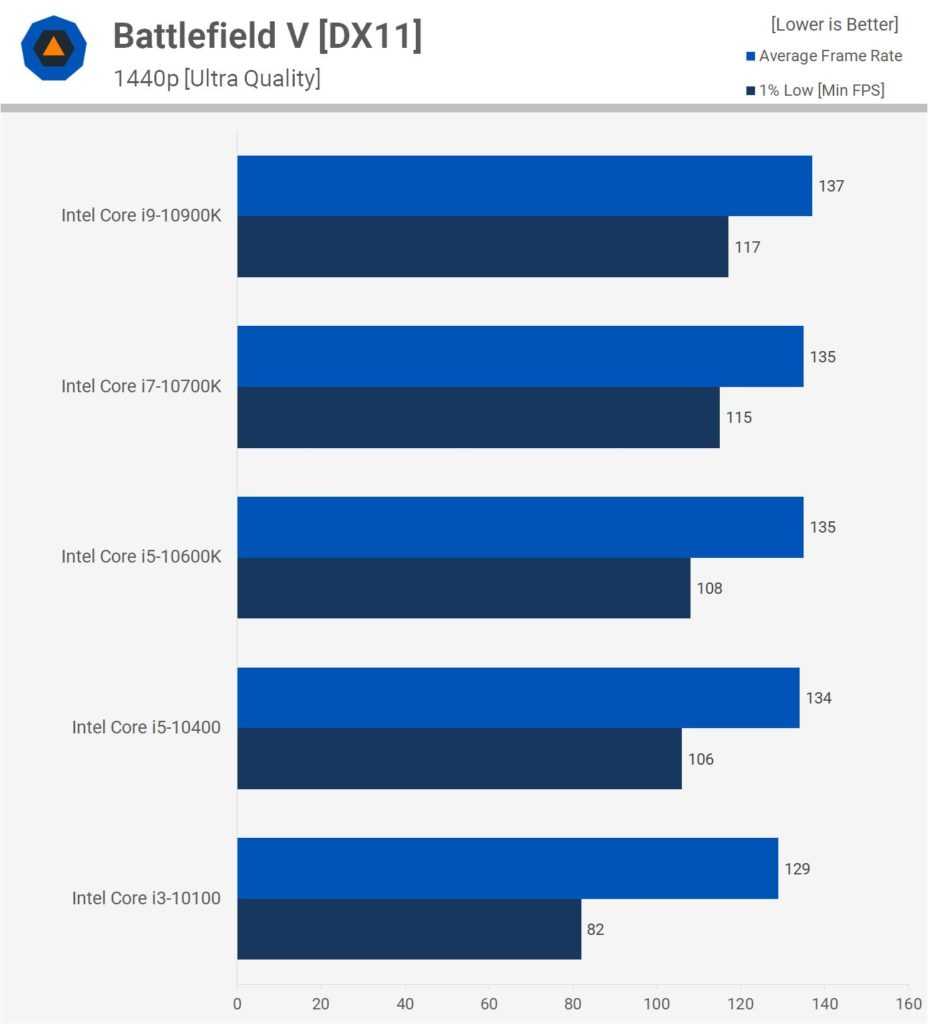 Для начала рассмотрим игру Battlefield 5 на разрешении 1080p с качеством графики Ультра. 10900K и 10700K ограничены возможностями видеокарты и в результате средняя производительность и нижний 1% производительности одинаковы. 10600K выдаёт такую же среднюю частоту кадров, но уступает в нижнем 1% на 8%.