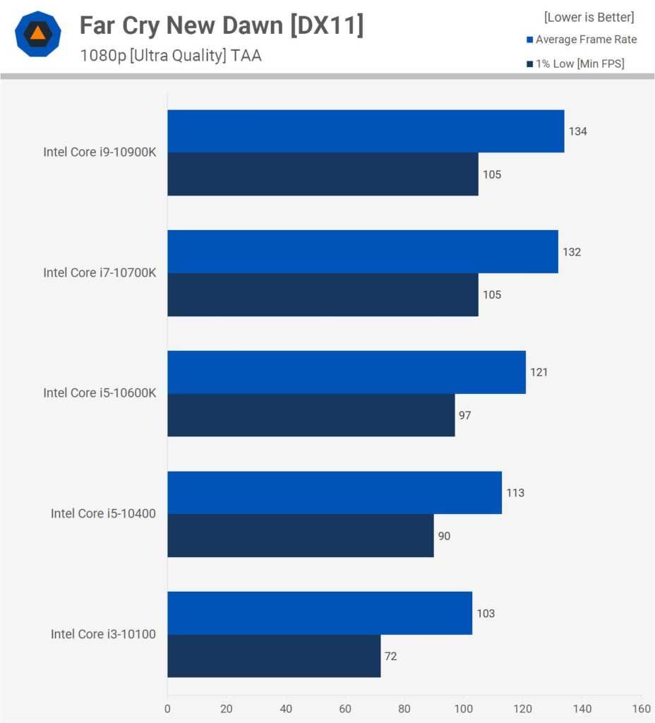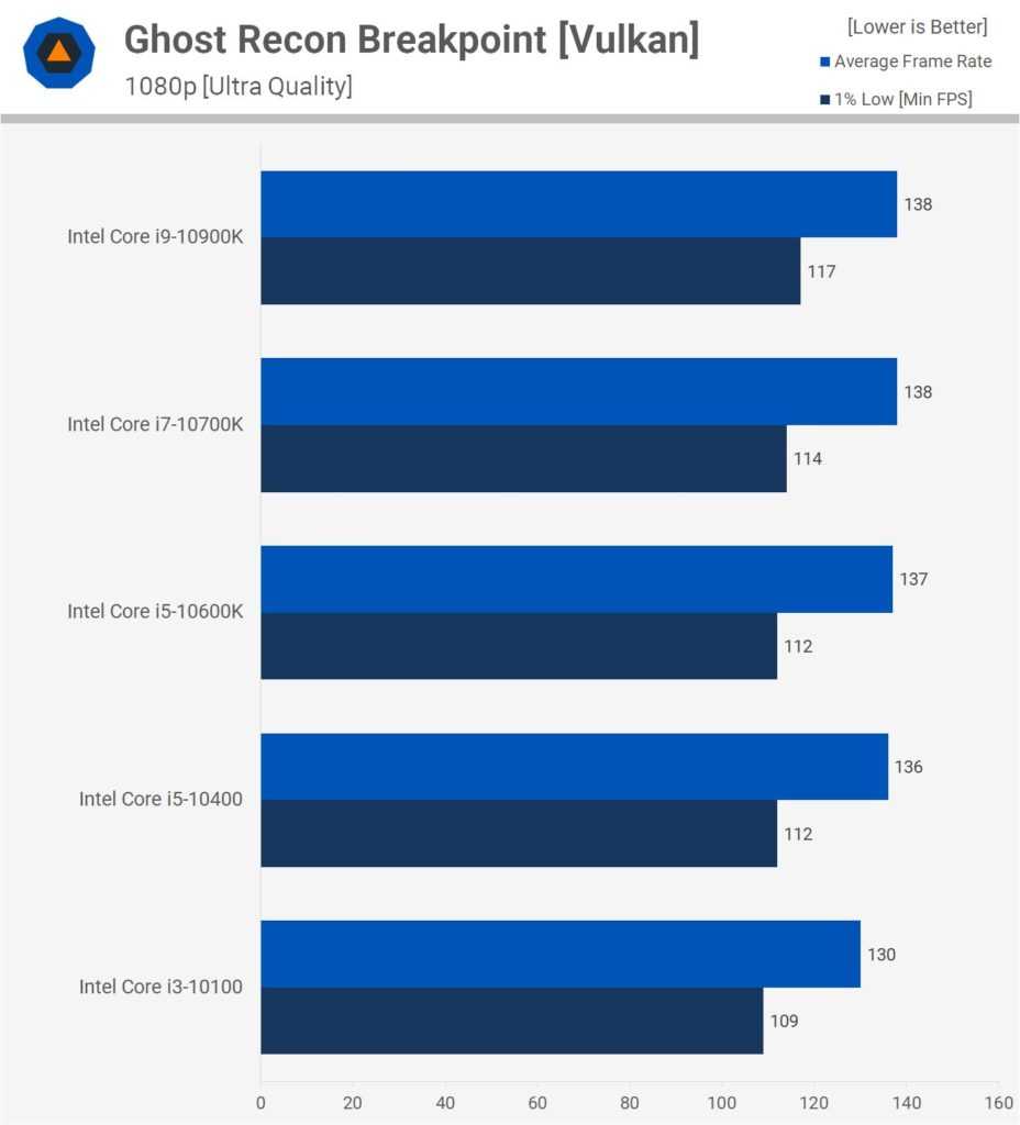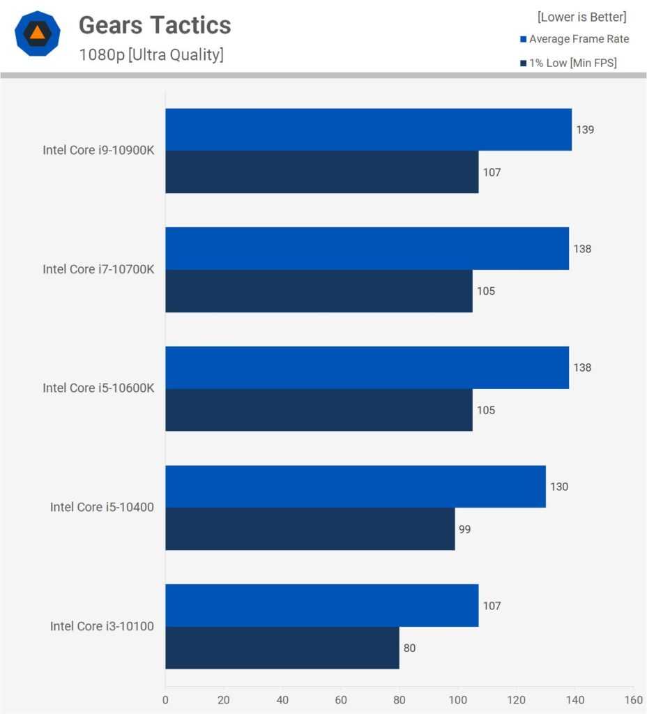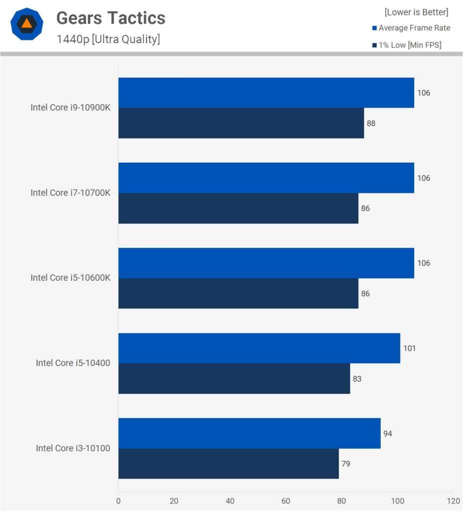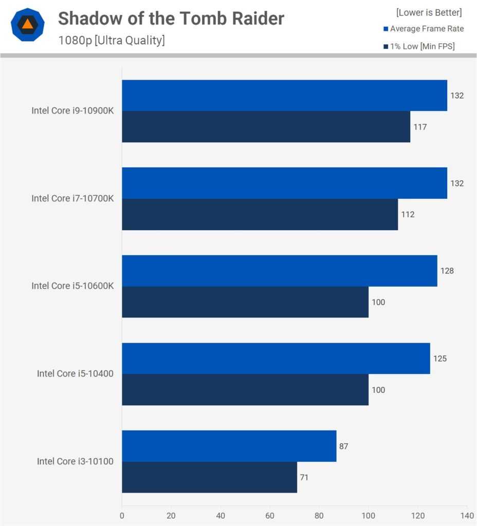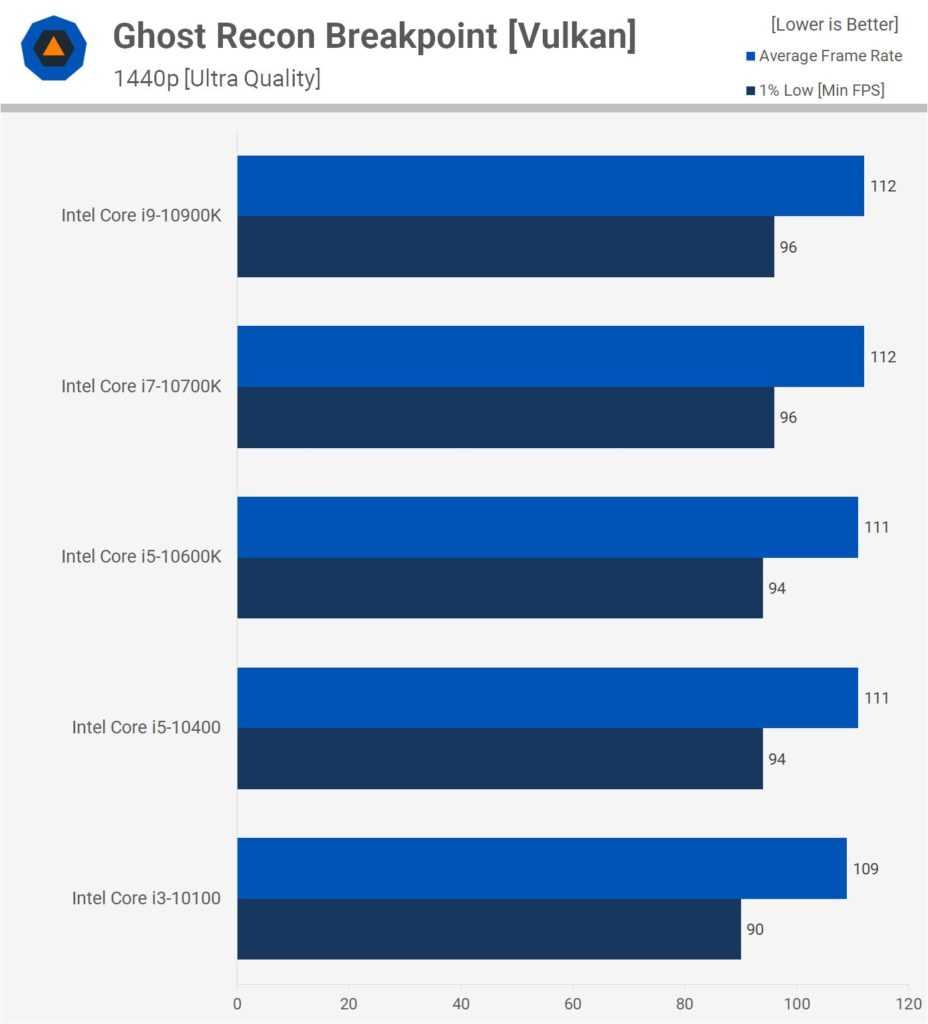 Ещё на 6% слабее показатели 10400, дальше на 22% отстаёт 10100. Если повысить разрешение до 1440p, разница в производительности между 10400, 10600K, 10700K и 10900K минимальная. Средняя частота кадров почти идентичная, тогда как 10900K почти на 10% опережает 10400 в нижнем 1% производительности.