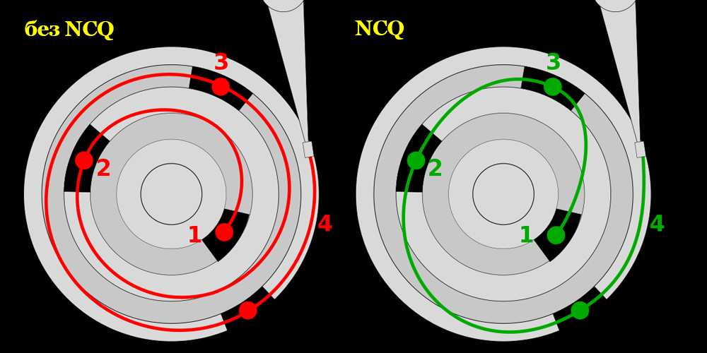 Не последнее значение имеет и поддержка стандартов жёстким диском. Например, технология NCQ, используемая в SATA-устройствах начиная с SATA/300 (Native Command Queuing — аппаратная установка очерёдности команд), позволяет накопителю принимать одновременно несколько запросов, перестраивая порядок их выполнения для наибольшей эффективности с учётом конструктивного исполнения устройства, что и способствует высокой скорости чтения. Устаревшая технология TCQ (тегированная очередь команд), используемая в некоторых ATA и SCSI жёстких дисках, похвастать высокой эффективностью по части повышения производительности не может ввиду некоторых ограничений по количеству посылаемых одновременно команд.