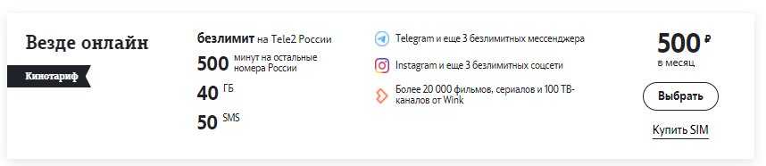 «Везде онлайн». Здесь вы получаете 40 ГБ трафика на месяц, чего более чем достаточно для большинства задач. Также в тариф включены 500 минут на все номера по России и 50 SMS-сообщений. А еще Tele2 предоставляет безлимитный доступ к популярным социальным сетям и мессенджерам.