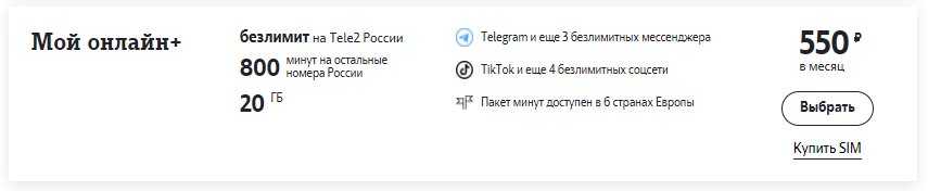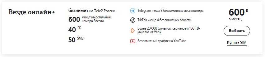 «Везде онлайн+». Улучшенная версия предыдущего тарифа Теле2, где вам уже будет доступно целых 80 ГБ мобильного трафика, а еще 50 сообщений и 600 минут во все сети. Предложение с социальными сетями также актуально, только сюда дополнительно подключается YouTube и TikTok.