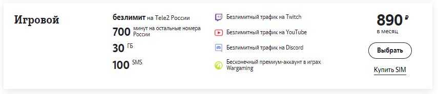«Игровой». Такое предложение актуально для любителей онлайн-игр, ведь тариф предоставляет 30 ГБ трафика, 700 минут на разговоры по России, а также пакет из 100 сообщений. И, что самое интересное, у вас будет безлимитный доступ к Twitch, YouTube и Discord.
