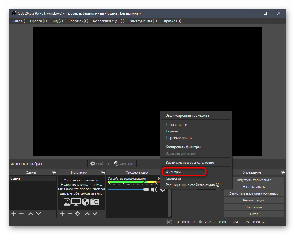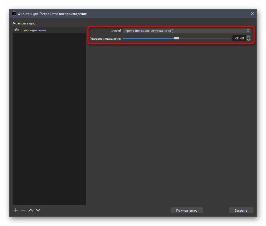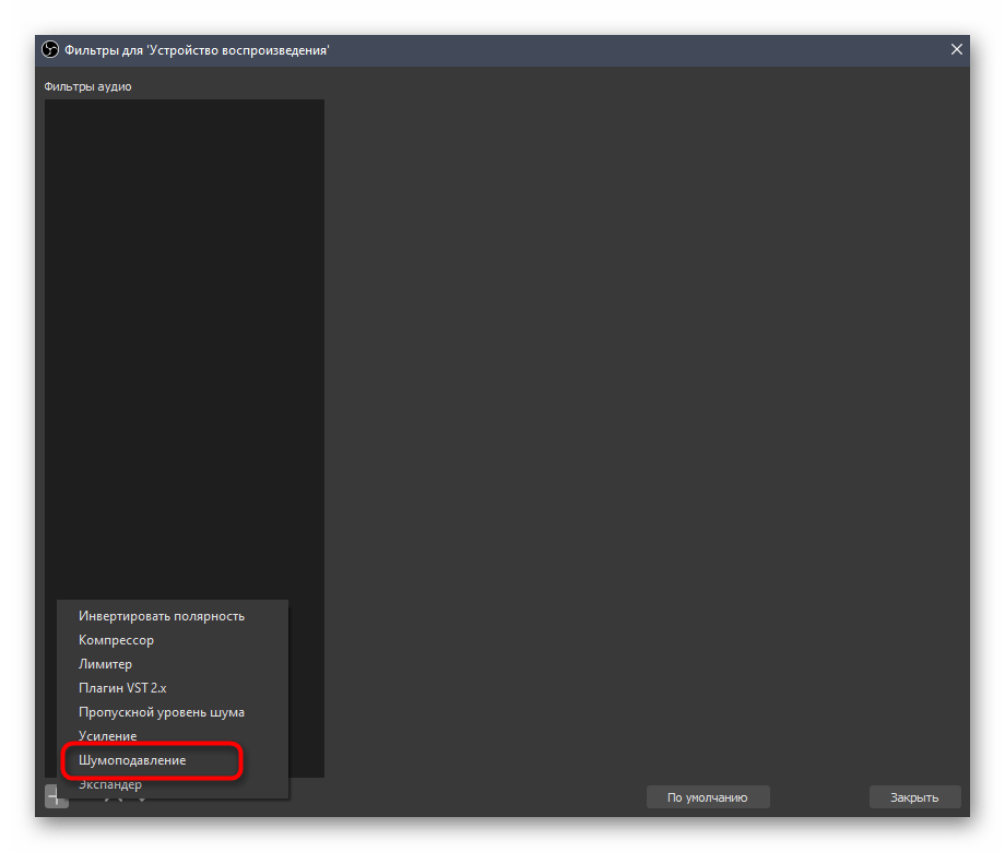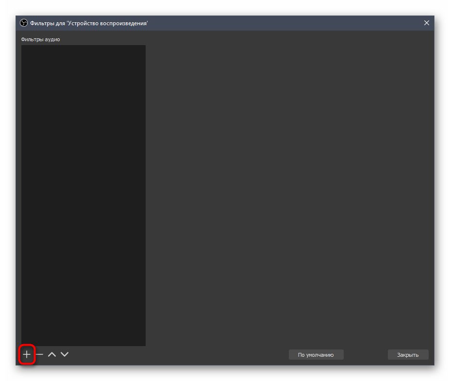 Для устройств записи и воспроизведения в OBS есть целый ряд шаблонных фильтров, добавляются которые кликом по значку в виде плюса.