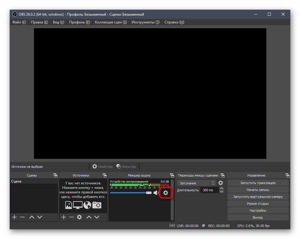 - Запустите свой профиль в OBS и в окне «Микшер аудио» щелкните по значку шестеренки напротив устройства записи.
