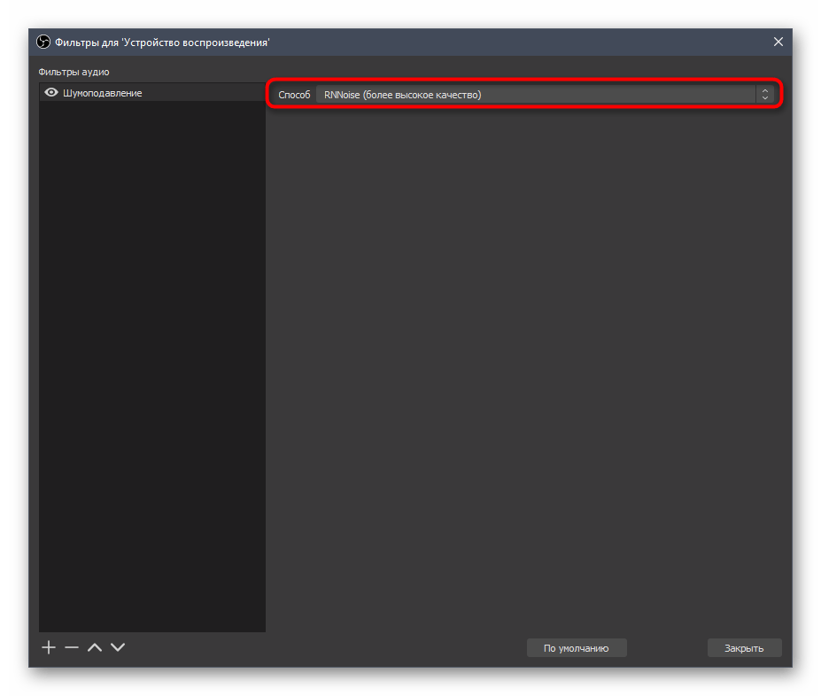 В OBS есть два фильтра, предназначенных для подавления шумов микрофона. Первый — «Шумоподавление» — работает в автоматическом режиме и предлагает пользователю только одну настройку при выборе профиля низкой нагрузки на процессор. Его мы и рассмотрим в первую очередь, поскольку отсутствие необходимости дополнительного выбора параметров — главный плюс этого фильтра для начинающих пользователей.