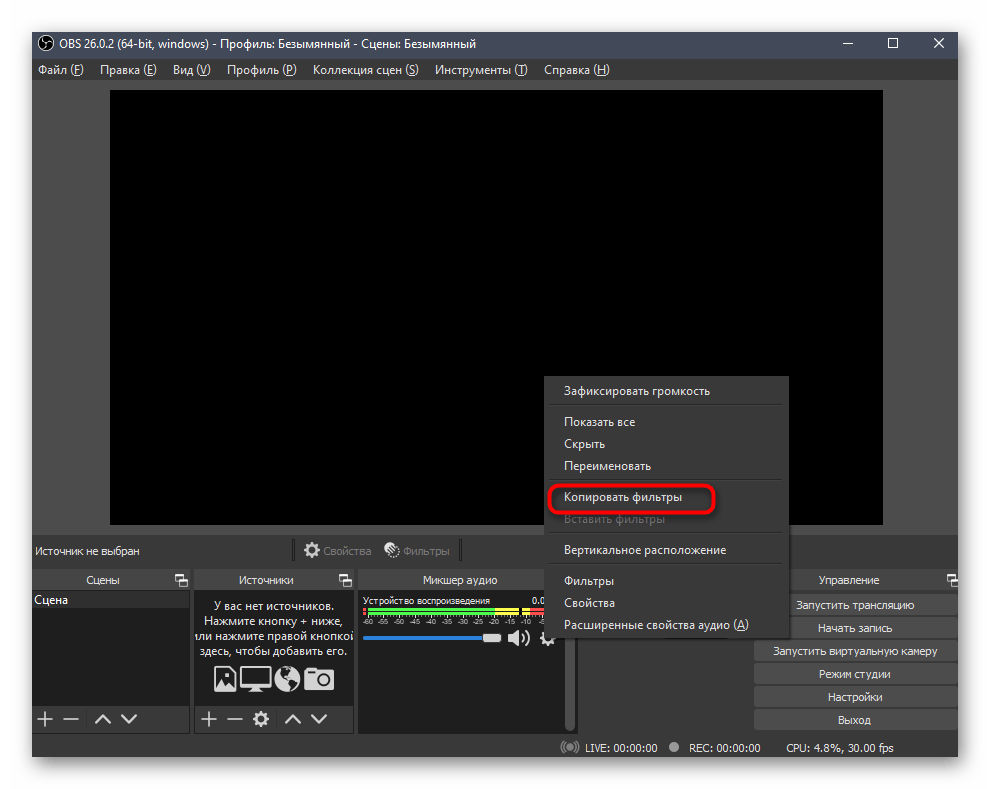 Если устройств записи подключено несколько, вызовите то же всплывающее меню с настройками и нажмите «Копировать фильтры». Затем выберите второй микрофон и щелкните на «Вставить фильтры». Это избавит вас от необходимости повторно настраивать каждый фильтр.