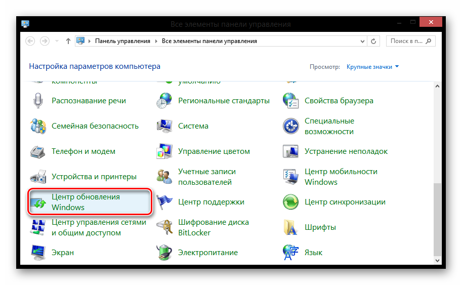 Этот способ отключения обновления подойдет лишь тем пользователям, у кого установлена Windows 7 или 8. Открываем центр поддержки, кликнув по нему в трее правой кнопкой мыши и выбрав пункт «открыть центр обновления Windows« или через панель управления, выбрав в просмотре «крупные значки«. После этого вам станет доступен пункт «Центр обновления Windows«. Открываем его.