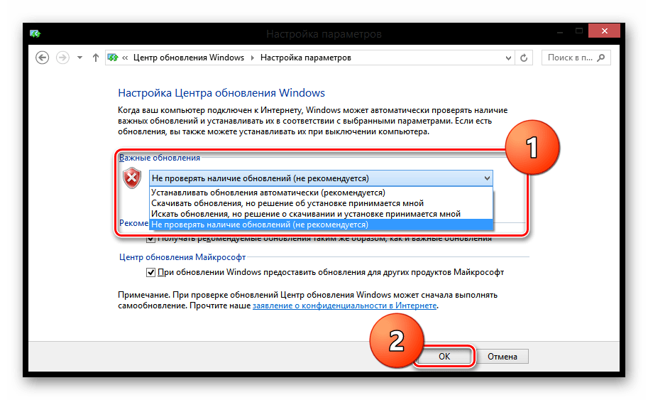 Здесь в первом же пункте с названием «Важные обновления» в выпадающем меню выберите необходимый пункт. В зависимости от того, что вы хотите, вы можете запретить поиск последних разработок вообще или же разрешить поиск, но запретить их автоматическую установку. Затем нажмите «ОК».