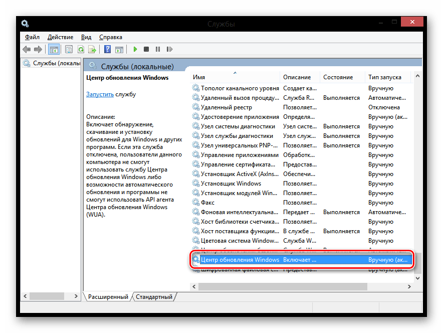 В центральной части откроется список названий сервисов, которые есть в «восьмерке». Ваша задача пролистать их в конец списка, где вы найдете «Центр обновления Windows».