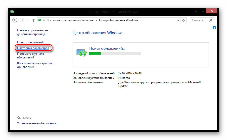 - В окне «Центр обновления Windows» нажмите на ссылку «Настройка параметров».
